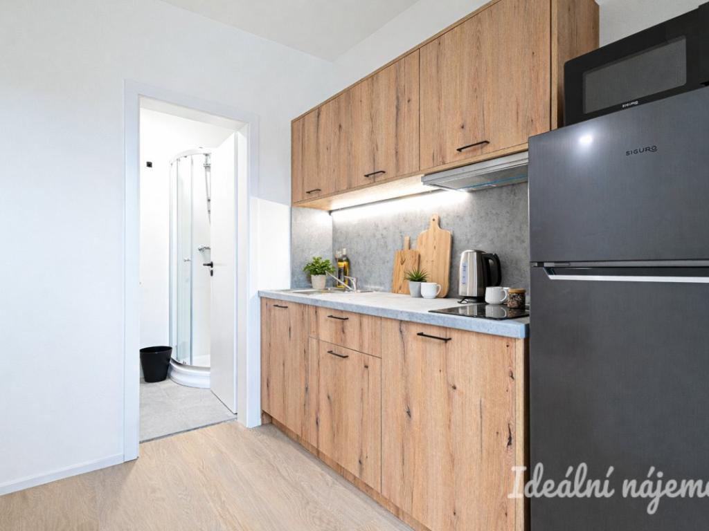 Interiér bytu je navržen s důrazem na funkčnost a čistý moderní design. Byt se nabízí plně vybavený. Kuchyňská linka je vybavena dřezem, lednicí, dvouplotýnkovou varnou deskou, digestoří a mikrovlnnou troubou. Součástí bytu jsou dále úložné prostory i kompletní zařízení obytné části (matrace nejsou součástí vybavení). Byt je ideální pro jednotlivce nebo pár, kteří hledají praktické a kvalitní bydlení v klidném prostředí s dobrou dostupností do centra města.