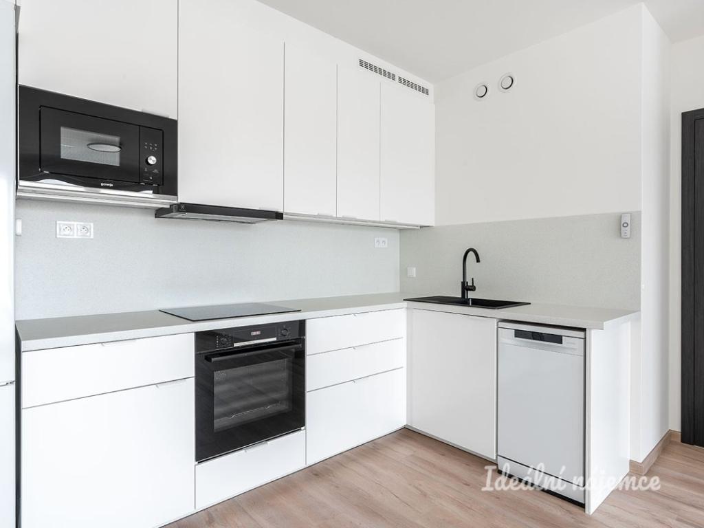V předsíni se nachází vestavěná šatní skříň s věšákem. Z předsíně se dostaneme do obývacího pokoje s kuchyňským koutem. Kuchyně se nabízí plně vybavena vestavnými spotřebiči - lednice s mrazákem, myčka nádobí, indukční varná deska, elektrická trouba a digestoř značek Electrolux a Liebherr. Obývací pokoj i ložnice jsou nezařízené. V koupelně se nachází sprchový kout, závěsná sanita a přípojka s vývodem na pračku. Okna jsou zde kvalitní trojskla s výbornou tepelnou i zvukovou izolací.